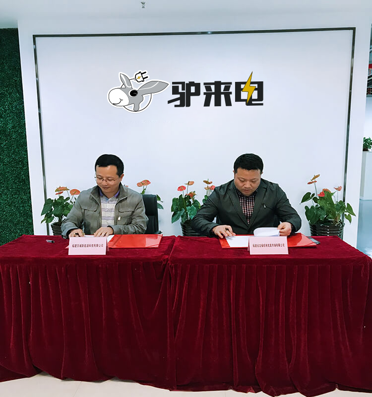 熱烈慶祝福建驢來電新能源科技有限公司與福建龍福機電市場就“驢來電”充電站成功簽約! 2017年11月22日,福建龍福機電副總何萬芬、運營總監(jiān)黃巍偉蒞臨福建驢來電新能源科技有限公司商談“驢來電”充電站合作事宜并成功舉行了簽約儀式。